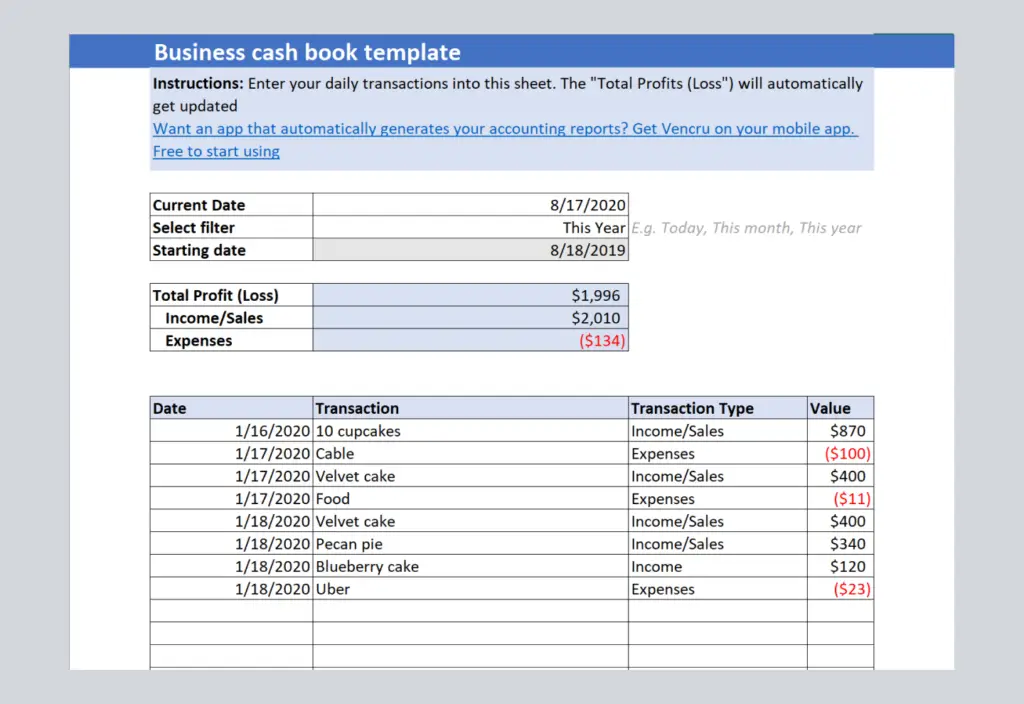 Track your transactions by entering your sales and expenses numbers in the Excel cash book template
